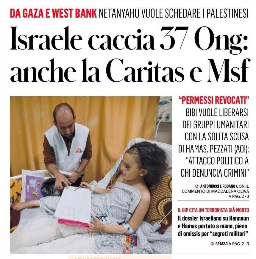 🏴☠️🏴☠️🏴☠️Lo stato terrorista israelianoha vietato l’attività a 37 organizzazioni umanitarie che lavorano nella Striscia di Gaza, inclusi Medici Senza Frontiere (MSF) e … Leggi tutto