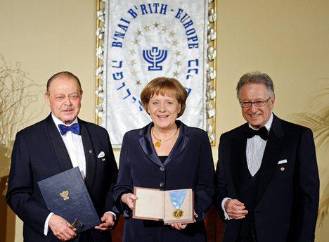 ANGELA MERKEL (KASNER) in una foto che la ritrae mentre ritira il premio dall’ordine massonico ebraico del B’nai B’rith Europe nel pranzo di gala in suo onore dell’11 Marzo 2008.