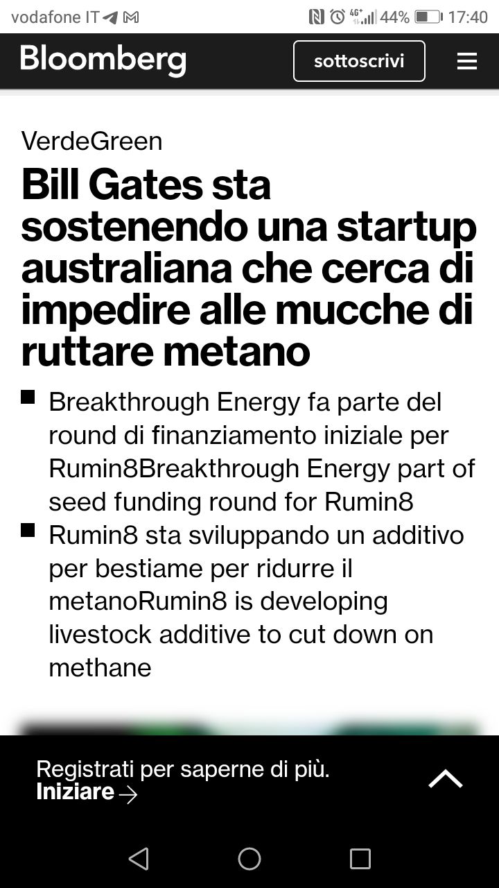 “Bill Gates si è unito a una serie di miliardari che investono in una startup australiana di tecnologia climatica che ha in programma di interrompere l’industria dell’agricoltura animale che emette metano con un additivo per mangimi coltivato in laboratorio. ” Si tratta di salvare il pianeta dalla CO2, e il Gran Profeta ha fiutato un affare: mentre gli “animali parlanti” qualunque dovranno mangiare insetti in quanto gli allevamenti di bestiame da carne saranno eliminati come gravemente inquinanti, alcuni potranno continuare a mangiare bistecche sapendo che vengono da vitelli che non hanno fatto puzze metanifere.