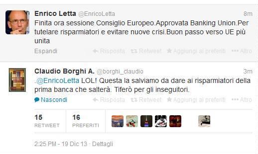 Il rispettatissimo Enrico Letta, palese “riserva della repubblica” (i grembiuli gli hanno trovato un parcheggio dorato alla Sorbona) è quello che nel dicembre 2013, capo del governo, twittava esultante: “Finita ora sessione Consiglio Europeo. Approvata Banking Union. Per tutelare risparmiatori ed evitare nuove crisi. Buon passo verso Ue più unita”.