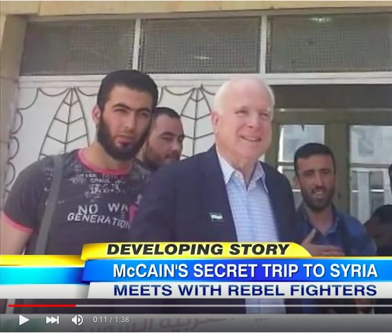 Ma anche se non fosse, nulla cambia del significato dell’immagine: mostra JohnMcCain che il 27 maggio 2013 è entrato in Siria dalla Turchia con il generale Salem Idris, che guida il Consiglio militare supremo dell’esercito siriano liber: la Free Syrian Army, i ribelli in armi contro il governo di Damasco, e altri “leader ribelli vivono ad Idlib. Alla fine di questa riunione, Mc Cain – attraverso il suo addetto stampa – ha proclamato che gli USA entrino con “un’azione militare aggressiva nella guerra siriana (che dura da due anni), ed ha chiesto che si armino e ribelli e venga istituita una no-fly zone” a loro protezione”.