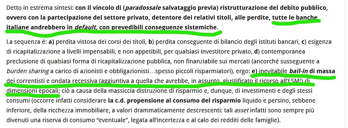 Infatti, ricapitoliamo: all’Italia viene richiesto di contribuire al MES (con 125 miliardi), ma gli è precluso ottenerne l’aiuto se una sua banca entra in crisi. L’aiuto del MES non viene concesso a paesi che abbiano un debito pubblico superiore al 60% del PIL; quindi, se collassa una nostra banca, a pagare sono i correntisti perdendo tutto. Tutti capiscono che la Germania sta accedendo alla idea di una assicurazione europea dei depositi sopra i 140 mila euro, perché vuole essere coperta dal resto degli europei quando collassa la Deutsche Bank.