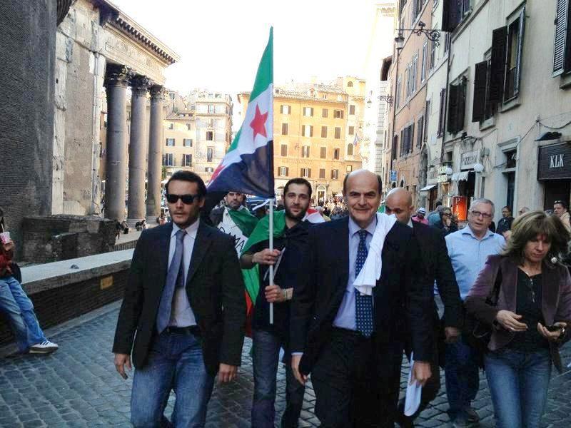E’ Bersani che sul palco, nel 2012, sostiene, a nome del PD, la “Armata Siriana Libera”, dichiarando che questi terroristi sono in realtà l’opposizione democratica. E’ precisamente quello che allora sostenevano Obama, Hollande, Cameron perché avevano deciso di invadere l’Irak, sterminare Assad e i suoi, e mettere al suo posto i terroristi di Al Qaeda, poi ISIS : bisognava infatti promuovere la democrazia. Poco tempo dopo avrebbero trovato il pretesto: un attacco al sarin nella località di Ghouta, con centinaia di morti (si disse): Assad “ha gasato il suo stesso popolo”, mandiamo i nostri soldati a liberare i siriani dall’orrendo dittatore. Diamo manforte all’opposizione democratica!
