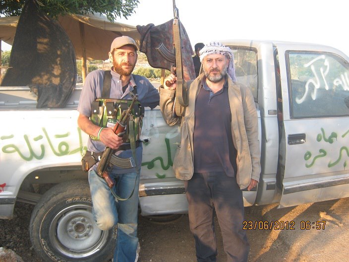 e’ quel barbuto che porta la bandiera siriana, dietro di lui. E’ lo stesso individuo che appare in quest’altra foto: il 23 giugno, con le armi in mano.