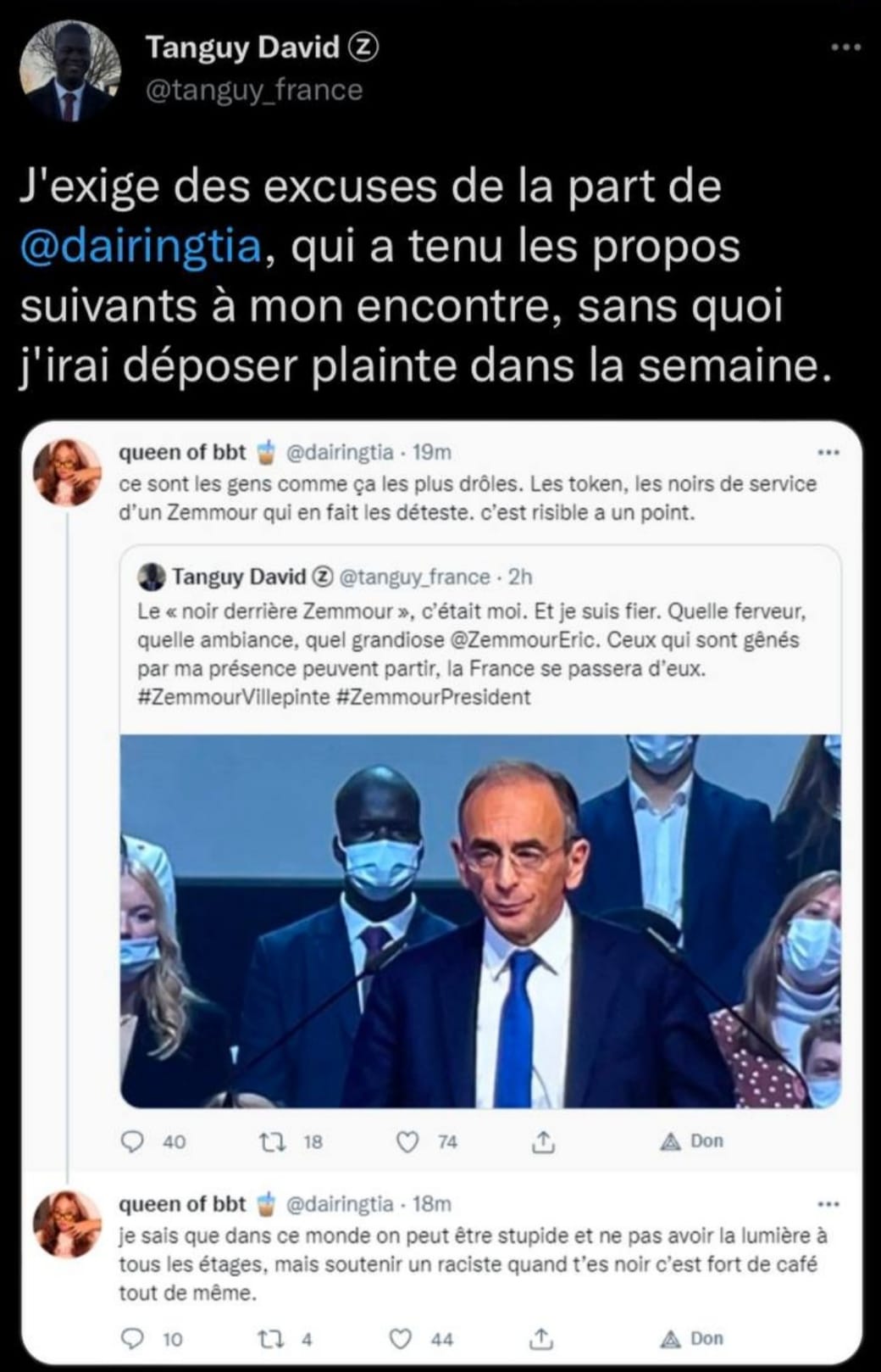 C’era un negro dietro al Zemmour durante il suo comizio… studente e militante per il candidato, Tanguy David ha ricevuto migliaia di messaggi razzisti dopo la sua apparizione in tv.