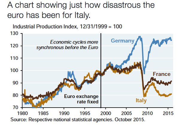 Io intanto vi dò una tabella pescata sui tweet, so come sia stato disastroso l’euro per l’Italia – ed anche per la Francia: