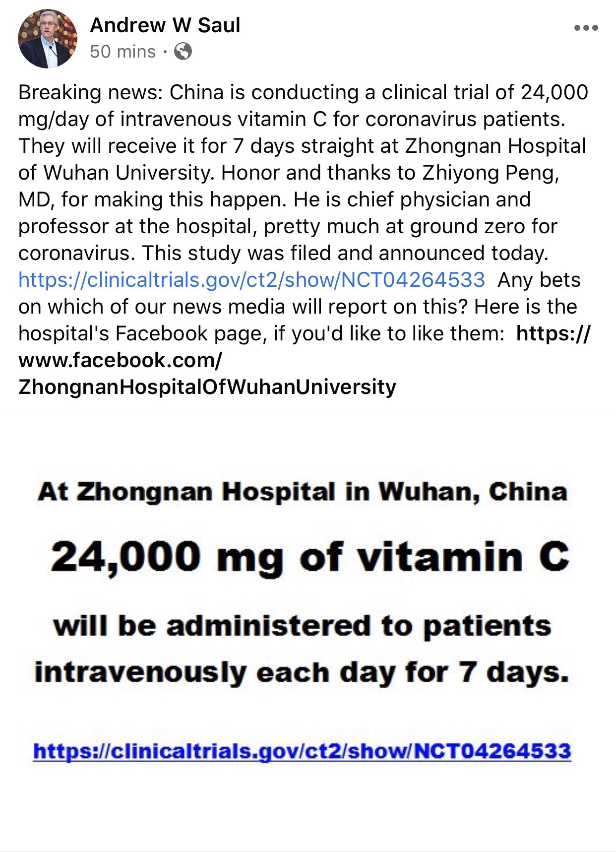 Il dottor Zyhong Peng, primario dell’ospedale della Wuhang University (praticamente il ground zero del coronavirus) ha annunciato una sperimentazione: 24 grammi di acido ascorbico in vena in infusione acquea per 7 giorni a 140 pazienti con coronavirus, come potente coadiuvante contro la gravissima infezione polmonare che provoca il virus.