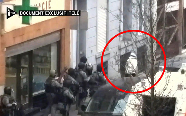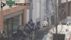 Dal 4.18 è il video di telegiornale iTelé. “La tensione è massima, i terroristi sono asserragliati e potenzialmente armati”, dice  il reporter.  Poi uno esce,  letteralmente a pochi centimetri dalle teste di cuoio e si mette  a scappare lungo il marciapiede. Ha un  berretto bianco floscio.  Gli armati gli sparano  da pochi metri, e apparentemente lo feriscono a una gamba.