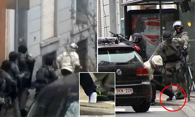 Ma la domanda vera forse è un’altra. E’ proprio Salah Abdslam questo personaggio col berretto  bianco? Ha il volto praticamente coperto. E la polizia, dopo averlo abbrancato, gli rimette il berretto (o quel che è)  di nuovo in testa, nascondendone il viso.  Palesemente, mentre viene fatto salire in auto, gli agenti in assetto di guerra lo nascondono col loro corpo. Come mai? Forse perché il viso di Salah Abdeslam   è troppo conosciuto,   essendo la  segnaletica apparsa su tutti i media?