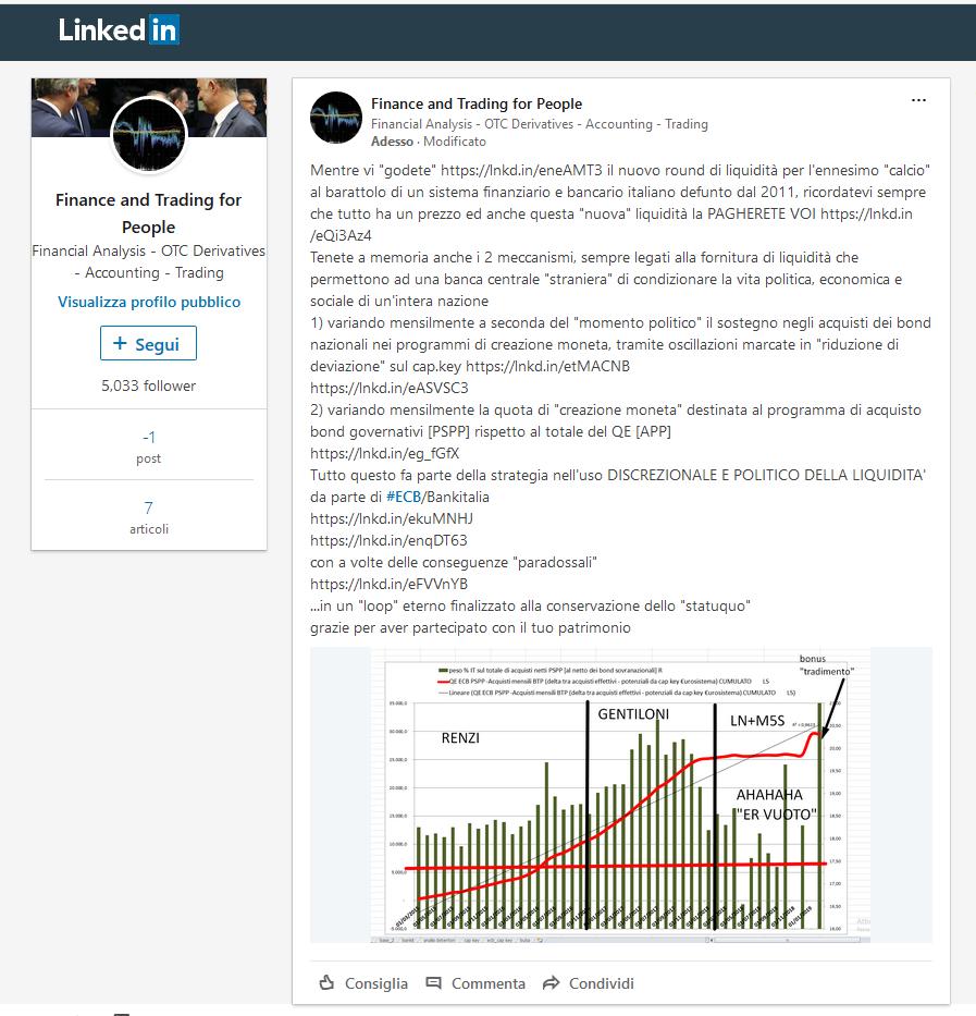Ricordiamo che la BCE ha rivelato che dal 2010 ha fatto 73 miliardi di profitti lucrando gli interessi dei titoli pubblici di Grecia, Italia, Spagna e Irlanda. Il segreto? Ha creato dal nulla quasi 2 mila iliardi di euro, e li ha prestati ad interesse ai paesi in difficoltà. I quali, per essere stati bollati come “In difficoltà” , hanno dovuto pagare (alla BCE) interessi più alti. Anche esosi. Ci dicono che “i mercati” chiedono tali interessi alti perché non si fidano e temono che diventiamo insolventi. In realtà, i “mercati” non c’entrano niente. E’ la BCE che manipola “discrezionalmente e a scopo politico” i tassi, come ampiamente dimostrato da guado: