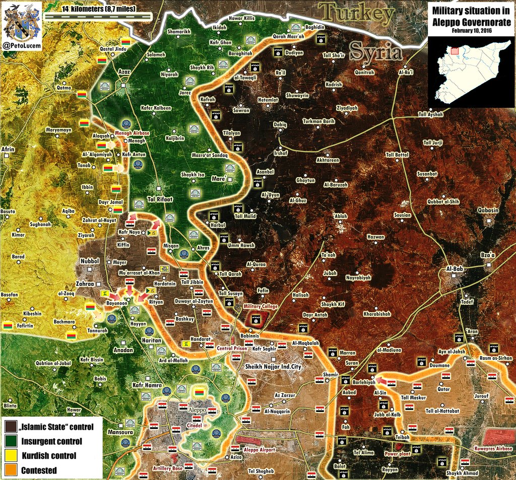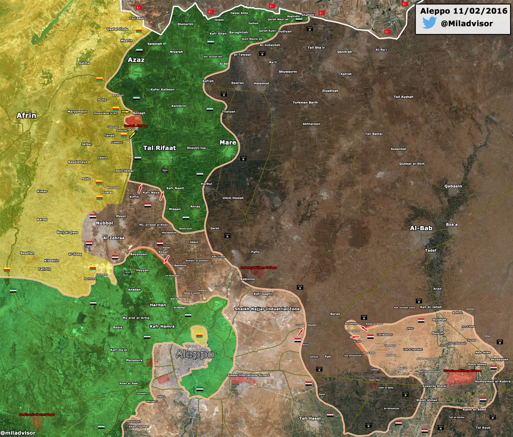 Notare bene come le forze siriane regolari abbiano giá circondato Aleppo, ma senza ancora aver raggiunto il territorio curdo di nord-ovest, in modo da tagliare le vie di rifornimento per le bande terroristiche ancora all’interno della parte occupata della cittá di Aleppo.