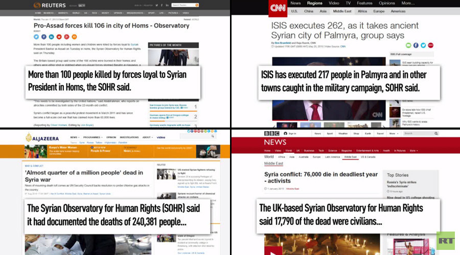 Una è il Syrian Observatory for Human Rights, che ha sede ha Coventry, Regno Unito, in casa di un tal Rahmi Abdul Rahman, che è un oppositore di Assad, e dice di essere in contatto telefonico con sue fonti in Siria. E’lui che ha dato la notizia (falsa) dell’uso, da parte dell’aviazione siriana, di “barili” pieni di cloro o qualche altra “arma chimica”: E’ lui che valuta le perdite civili in 240 mila, e via crescendo. Nessun “grande giornalista” s’è mai provato a controllare in modo indipendente i dati di Abdul Rahman. Invece molte notizie televisive cominciano: “Il Syrian Observatoy for Human Right”. Come si fa a dubitare di un “Osservatorio sui Diritti Umani”? E il gioco è fatto.