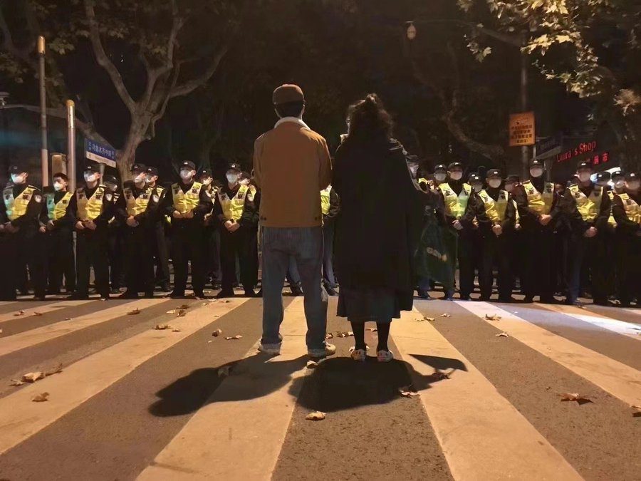 Secondo quanto riferito, questa foto mostra due professori cinesi a Shanghai in piedi coraggiosamente tra dozzine di poliziotti e studenti che protestano.