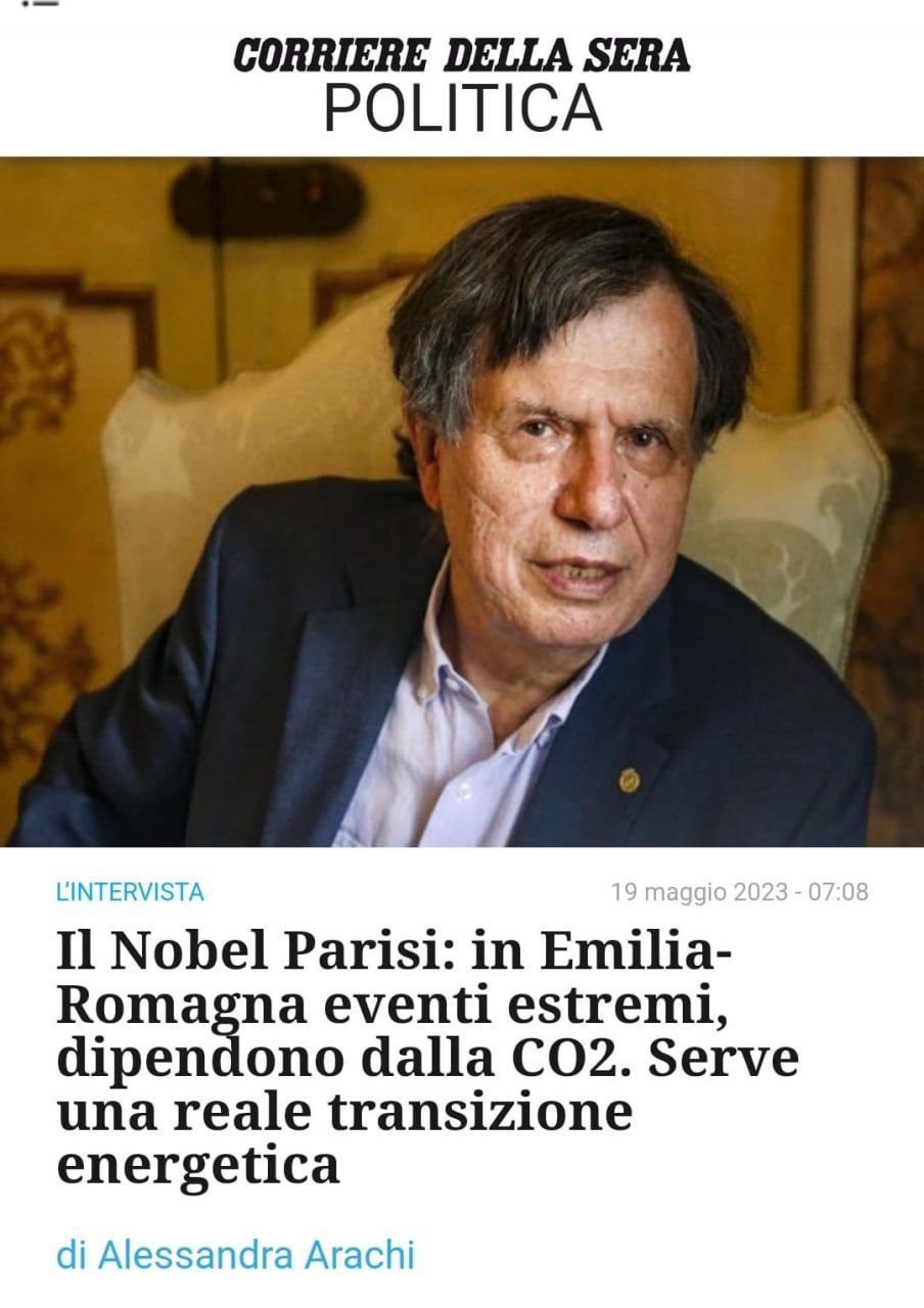 Ci ricorda il Nobel Parisi, in un’intervista al Corriere della sera del 10 maggio, il cambiamento climatico, causato da CO2 di origine antropica, sarebbe all’origine di questi eventi estremi, ma… come emerge dal grafico allegato le emissioni di CO2 da energia fossile, in Italia e in Europa sono ritornate ai livelli del 1965: sorge la domanda se non sia proprio questa esatta quantità di Co2 a causare alluvioni epocali, chi non ricorda infatti quella del 9 novembre 1966 che devastò Firenze?