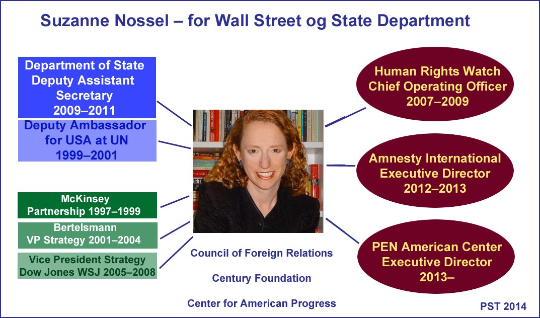 La cosa si spiega ricordando che la direttrice esecutiva di Amnesty International fra il 2012 e il 20’13, Susan Nossel (j), è una femminista americana che prima, nel 2009, ha lavorato – guarda la combinazione – per il Dipartimento di Stato di Hillary Clinton, col grado di “deputy assistant Segretary of State”; in quella veste “ha guidato l’impegno Usa presso il Consiglio Onu dei Diritti Umani, promuovendo risoluzioni contro Iran, Siria, Libia, Costa d’Avorio in tema di diritti umani, libertà d’espressione di associazione; nonché la prima risoluzione ONU sui diritti di lesbiche, gay, bisessuali e transgender”. E’ anche la curatrice della nota storia “persecuzione delle Pussy Riot” e autrice della relativa grancassa mediatica.