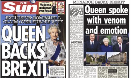 Che la regina sia a favore del Brexit è quasi certo: l’ha strillato il Sun nel marzo scorso (“Queen Backs Brexit!”), raccontando che la sovrana ha avuto persino un litigio sul tema con Nick Clegg il vice-primo ministro: “La Ue va’ sulla strada sbagliata”, avrebbe detto. La smentita di Buckingham Palace criticava soprattutto il titolo, strillato, come sono quelli del tabloid super-popolare.