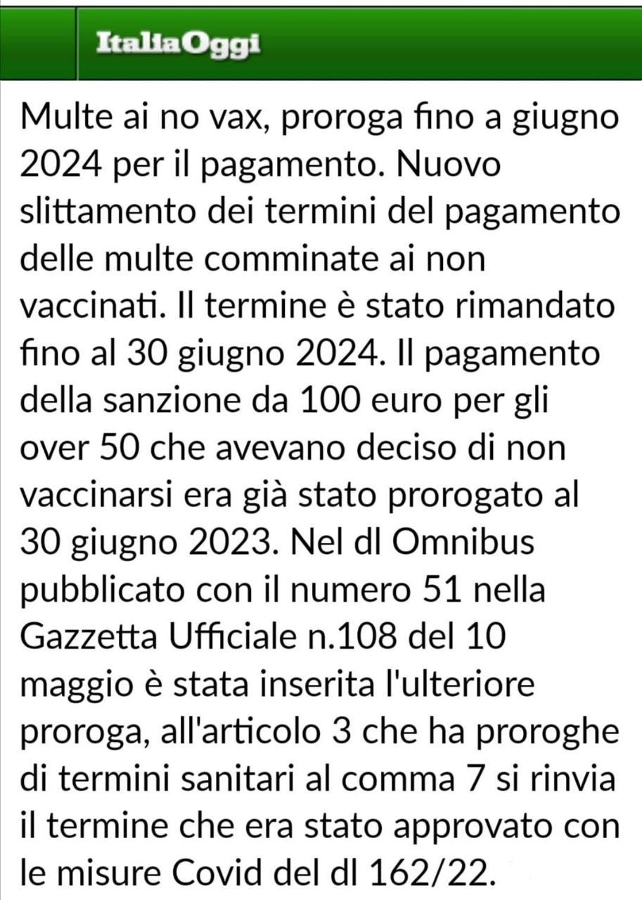 Il governo ha approvato il DL 51/2023 che all’art. 3, comma 6, prevede la proroga del termine per il pagamento delle cosiddette “multe over 50” (che riguardano anche le altre categorie obbligate all’inoculazione del siero Covid-19, come gli operatori sanitari) fino al 30 giugno 2024. La proroga riguarda tutte le attività e tutti i termini connessi alla notifica degli avvisi di addebito come abbiamo già spiegato con riferimento alla precedente proroga (sul canale e su YouTube la questione è stata trattata ampiamente).