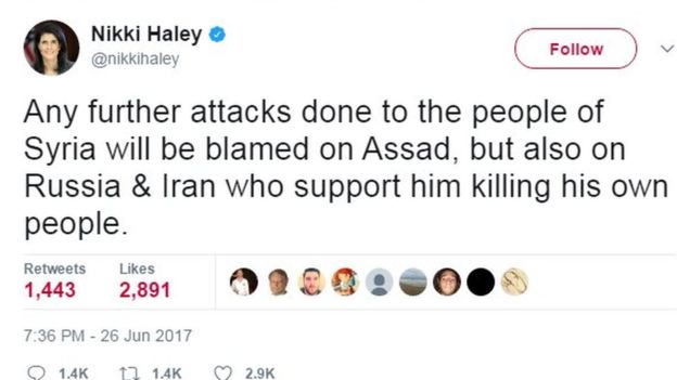 Nikki Haley, l’ambasciatrice americana all’Onu, ha rincarato: “Ogni altro attacco contro il popolo di Siria sarà imputato ad Assad, ma anche a Russia & Iran che lo sostengono mentre uccide la sua propria gente”.