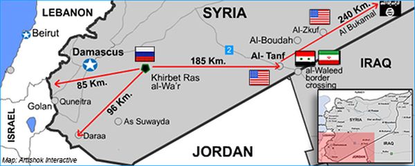 Secondo DEBKA, la nuova base russa verso il Sud siriano (che sta tanto a cuore ad Israele), è iniziata in coincidenza con la ripresa di colloqui segreti tra USA e Russia ad Amman, fra lo special envoy Usa Michael Ratney e il russo Aleksandr Lavrentiev, il 22 giugno. Lo scopo è tentare un accordo trilaterale (Russia Usa e Giordania) per creare una zona smilitarizzata “nel sud della Siria, che coprirebbe anche confini israeliani e giordani”.