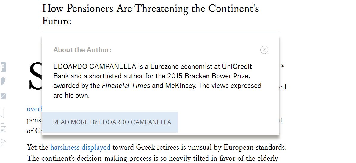 Lo stato comatoso delle nostre (loro) banche, il possibile crollo imminente di tutto l’ambaradan finanziario e lo scompenso in exitus del cancro dello short; il fatto che i vecchi pensionati europei “rappresentino una minaccia per il futuro del continente”, come dice questo personaggetto qua (per dirla alla De Luca). (Pensasse piuttosto alla sua banca in dépassée che offre mutui se acquisti almeno due cellulari della nota marca e altri oggetti da catalogo).