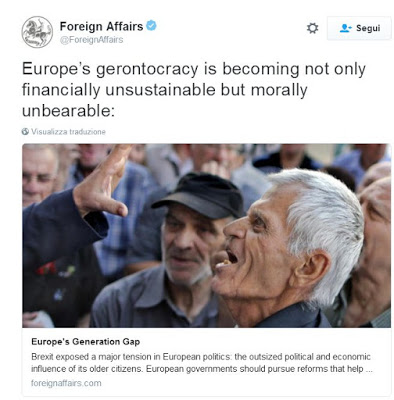 Mi piacerebbe chiedere a questi di Foreign Affairs quale soluzione (finale) proporrebbero per il problema dei vecchi europei. Essendo non più così giovane da non preoccuparmi e abbastanza anziana da averne motivo, sarei interessata a saperlo. Qualcosa tipo Aktion T4? Morte per fame, iniezioni di Luminal o camere a gas?
