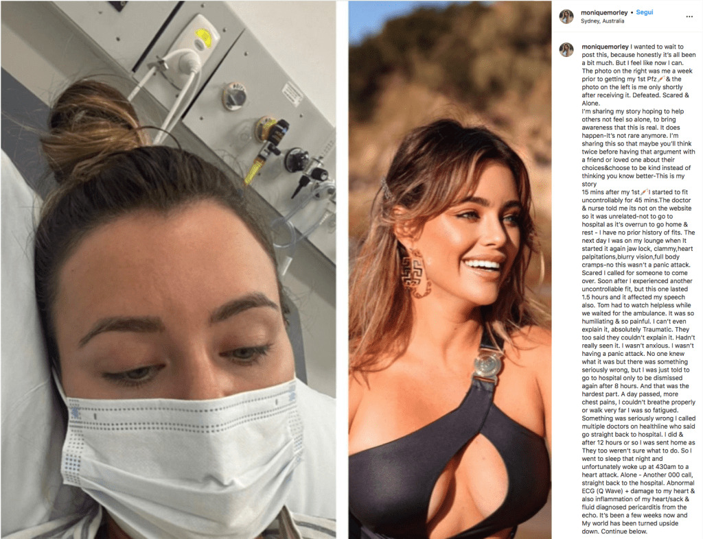 Monique Morley, star del reality “The Bachelor”. Infarto e pericardite dopo la prima dose di Pfizer