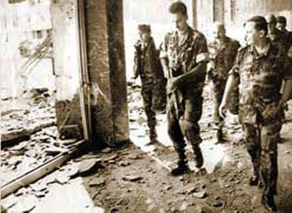 1989. Il generale Aoun, a destra, nel palazzo danneggiato.