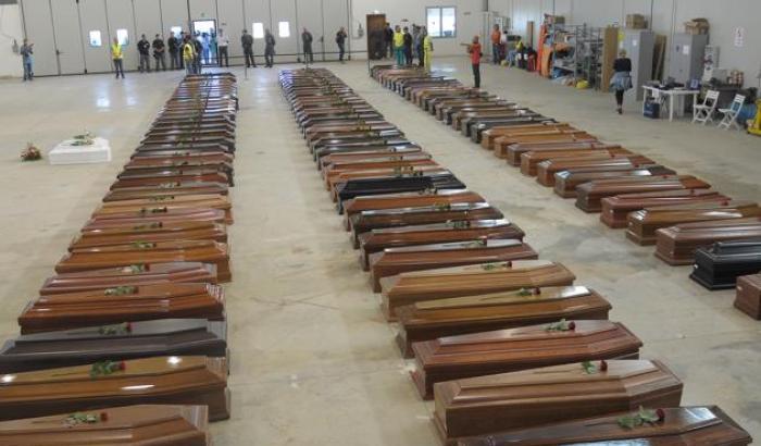 L’indecente falsificazione giornalistica  pro-terrore è giunta a questo: che ha presentato come di Bergamo la fila di bare del naufragio di lampedusa  dove morirono 360  migranti, nel 2013: