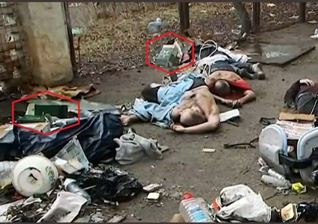 A scoppio ritardato si è messa in moto la macchina della propaganda NATO e MI6 a creare il “casus belli”. Nella foto i cadaveri dei civili colpevoli unicamente di portare a casa delle razioni umanitarie Russe.