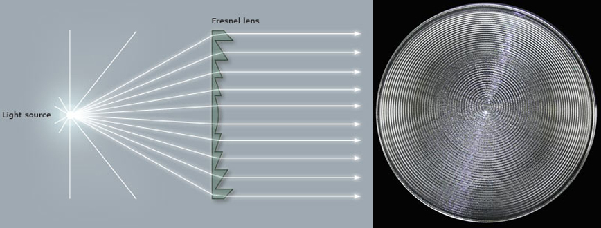 Visibilissime nella foto le scanalature tipiche delle lenti di Fresnel.