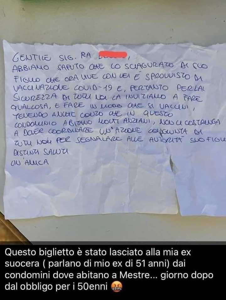 Aspettate qualche settimana, e saremo arrestati – a furor di popolo: già le televisioni dicono che se i vaccinati si ammalano di covid, è per colpa dei no vax che vanno in giro a infettare. La gente lo crede già. Guardate quello che è stato apposto sulla porta di un a famiglia:
