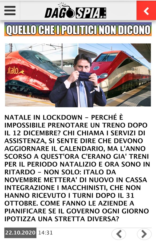 Gli tolgono i viaggi, gli vietano di andare da una regione all’altra, da un comune all’altro, da una strada all’altra. I servizi ferroviari non sono più previsti dopo il 12 dicembre. Il governo dittatoriale ha già deciso il lockdown completo a Natale?![]()