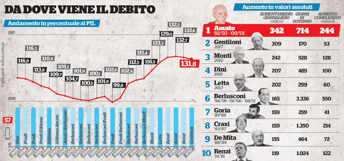 Riprendo da IcebergFinanza questa tabella. E ricordare che nel 1980, quando ancora vigeva il “matrimonio” fra Tesoro e Banca Centrale, il debito publico era sotto il 60% del Pil: il risparmio italiano finanziava se stesso, e la crescita del Pil. Nel 1981, non per legge bensì con un paio di lettere che si scambiarono privatamente il ministro del Tesoro (Andreatta) e il governatore di Bankitalia (Ciampi), quest’ultima cessò di acquistare i BOT che i “mercati” non assorbivano, come aveva fatto prima, in pratica cessandfo di calmierare gli interessi sul debito.