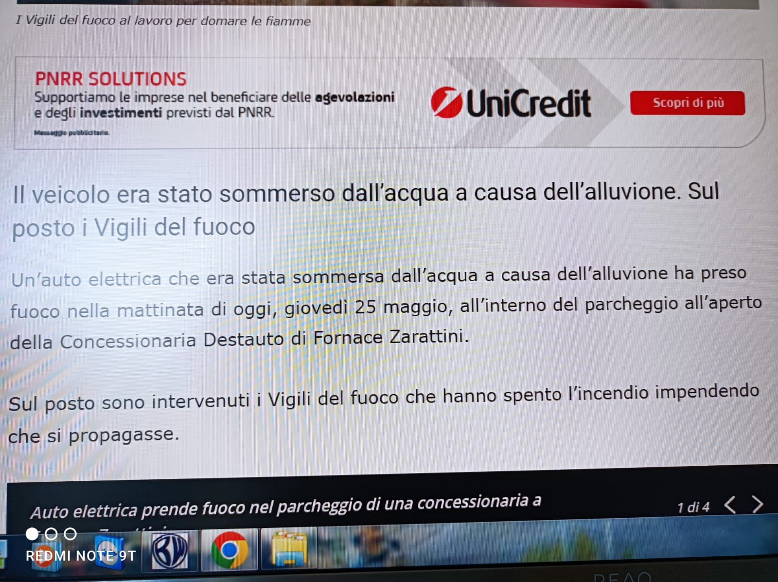 L’onda lunga dell’alluvione ha provocato un incendio questa mattina a Ravenna alla Destauto… Questa mattina una Nissan elettrica ha preso fuoco in autocombustione. L’auto si trovava in una posizione preventivamente mappata, come previsto, consegnando ai vigili del fuoco la documentazione circa l’esatta posizione del posteggio. Le fiamme sono pertanto state spente in pochi minuti. L’incendio della Nissan ha generato comprensibile panico tra gli addetti, con carro attrezzi all’opera per salvare il salvabile. I Vigili del Fuoco hanno provato in tutti i modi a spegnere le fiamme che provenivano dalla parte bassa della vettura, ma è stata un’operazione molto complicata legata alla natura elettrica dell’auto. Un tipo di auto che dopo un’alluvione come questa, essendo rimasta parzialmente allagata per giorni, deve essere “bonificata” separandola dagli altri veicoli per almeno 16 giorni, ma non c’è stato il tempo materiale per compiere questa operazione che in agenda era programmata per oggi. L’ennesima ferita di una alluvione devastante. (Video Massimo Fiorentini)