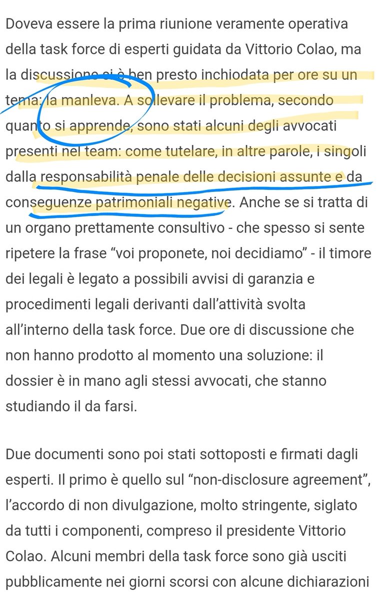 Vittorio Colao e la sua “task force” di tecnici sopraffini che farà rifiorire l’Italia, per prima cosa ha preteso l’immunità penale e civile per sé e i suoi tecnocrati. Vuole insomma l’esenzione anticipata da ogni responsabilità criminale per gli atti e le decisioni che prenderà lui e la “task force”.