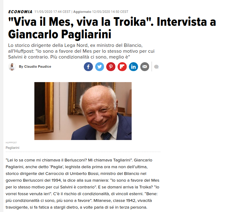 E capisco, adesso, anche perché i leghisti come Giorgetti, il governatore Fontana e in genere i governatori del Nord siano favorevoli al MES e vorrebbero utilizzarlo: rivelazione datami con toni scandalizzati da Mitt Dolcino, che chiama questi avversari di peso a Salvini come “i pretoriani dell’euro tedesco”.