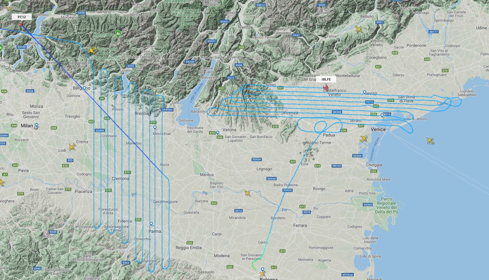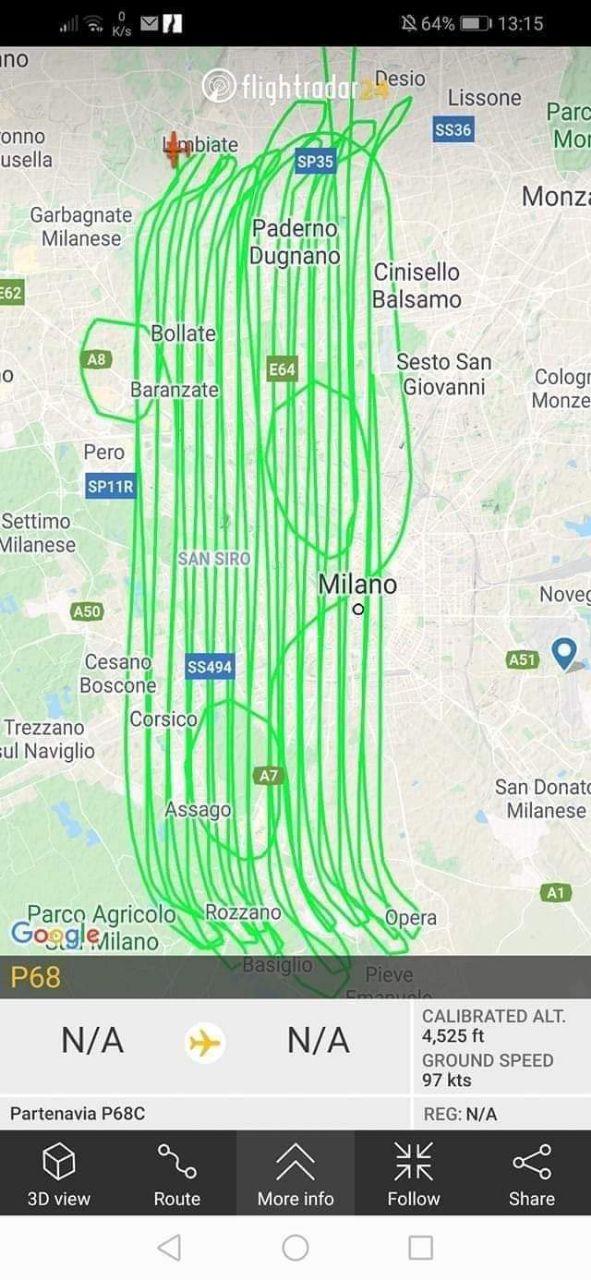 Autore della scoperta l’ottimo Cesare Baronio, noto come sopraffino polemista cattolico nel suo blog Importune et Opportune. Adesso anche acuto detective, ha scoperto le tracce radar di due strani aerei che, decollati dalla Svizzera, nel primo pomeriggio hanno “arato” minuziosamente specifiche zone della pianura padana. Giudicate voi stessi.