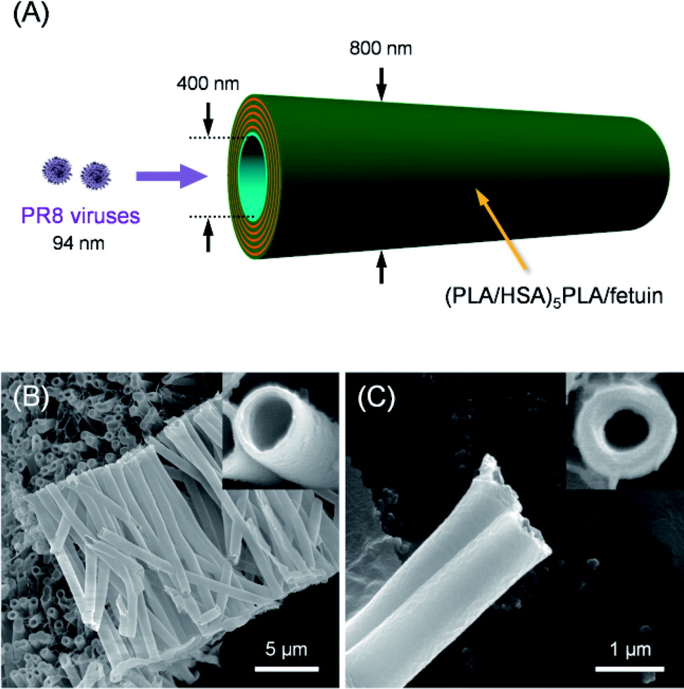 Un gruppo di studiosi giapponesi della Keio University comunica che ha fabbricato un nano tubo (diametro esterno 400 nanometri, cavo interno di 200 nm) che intrappola i virus dell’influenza, dalle dimensioni di 94 nanometri.