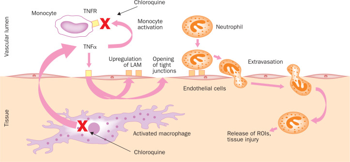 Il TNFα è prodotto da monociti / macrofagi attivati. Tra le sue molteplici funzioni aiuta ad attivare i monociti a riposo e favorisce lo stravaso di neutrofili aprendo giunzioni strette tra cellule endoteliali vascolari umane e sovraregolando le molecole di adesione leucoyte (LAM).  clorochina riduce la produzione di TNFα e downregula i recettori 1 e 2 del TNFα (TNFR) sulla superficie cellulare dei monociti, il che si traduce in una riduzione dell’attivazione dei monociti e in una riduzione dello stravaso di leucociti. Le croci rosse segnano i gradini direttamente inibiti dalla clorochina.