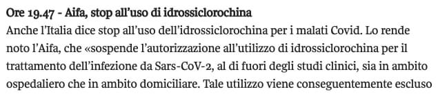 Ora l’OMS (quella che ha atteso 2 mesi dal lockdown cinese, per dichiarare la Pandemia, ormai evidente; che per 4 mesi ha sostenuto che le mascherine NON servivano, ora sentenzia che l’Idrossiclorochina, è pericolosa. L’AIFA, asservita ai vari Ricciardi (dipendente dell’OMS e consulente di Speranza), al CTS (quelli che per due mesi hanno detto, si muore solo “con” Covid” e non “per” Covid, e che “le mascherine non servono”, si adegua all’OMS.