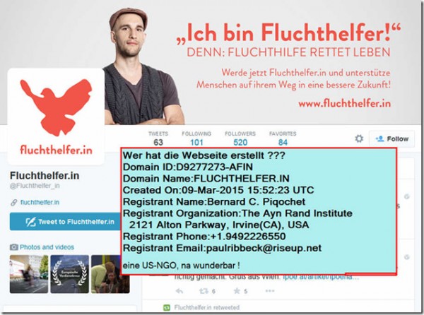 Un valoroso blogger , http://liberticida.blogspot.it/, seguendo le tracce lasciate da un’altra simile organizzazione tedesca e tanto caritatevole verso gli immigrati clandestini da aiutarli a passare i confini nascosti nelle auto dei volontari, luchthelfer.in, ha scoperto che essa è una emanazione della Ayn Rand Foundation, una fondazione ‘culturale’ Usa: “strana fondazione, la Ayn Rand, da una parte sostiene apertamente Israele e il sionismo, e non è strano, pensando al nome del suo direttore, Yaron Brook, dall’altra si oppone fermamente alla religione musulmana, e dal 2001 i suoi vertici affermano che : “occorre decidere tra uno sterminio di massa in America o nei paesi che sostengono il terrorismo” (citazione).