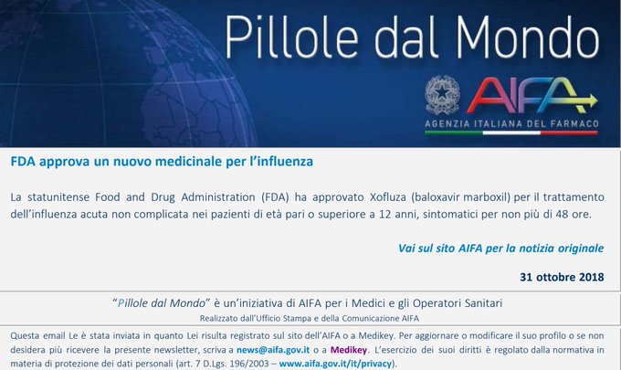 Per la prima volta in quasi 20 anni, la Fda ha approvato un nuovo trattamento per l’influenza, baloxavir marboxildi Roche, un farmaco orale monodose, giusto in tempo per fronteggiare la nuova stagione influenzale. Dovrebbe essere disponibile entro poche settimane e verrà commercializzato negli Stati Uniti con il marchio Xofluza.