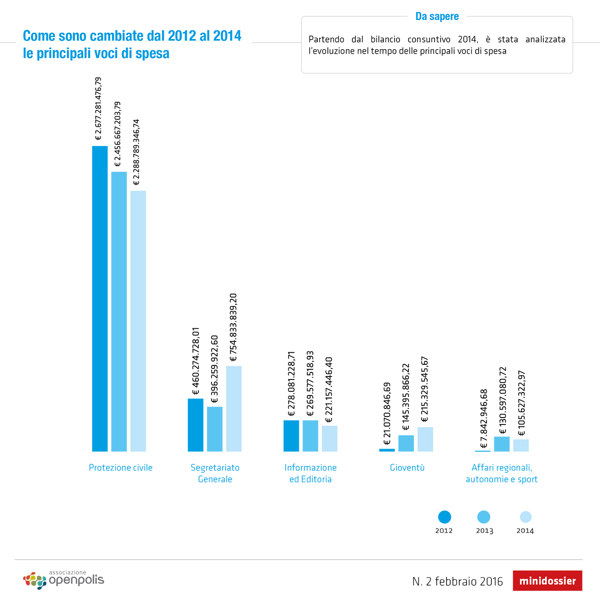 Ma quanto a “spese discrezionali”, tuttavia, la Protezione Civile è nulla in confronto al “Segretariato generale”. Si dedica alle “spese a supporto della presidenza, all’organizzazione e alla gestione amministrativa”: attività importantissime non meglio identificate. E non meglio sindacate e contabilizzate, men che meno rese pubbliche. Quanto spende il Segretariato Generale della Presidenza del Consiglio? Dipende: per esempio, nel 2013 si parlava di 396 milioni; l’anno dopo, 2014, saliti a 754 milioni.