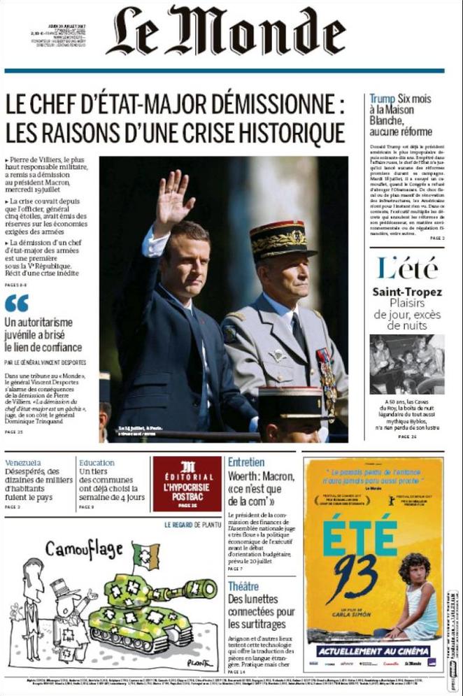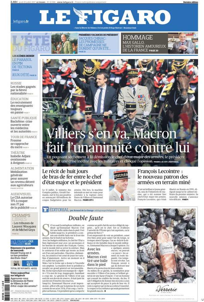 Umiliato pubblicamente da Macron per la sua protesta (a porte chiuse) contro il taglio di 850 milioni alla Difesa, il generale Pierre De Villiers, capo di Stato Maggiore, ha dato le dimissioni. Senza aspettare il colloquio con Macron, previsto il 21 luglio, dove sicuramente sarebbe stato dimissionato. “Ha lasciato passare il 14 luglio, e ha dato le dimissioni. Oggi la sua dignità è perfettamente preservata”, ha detto il contrammiraglio Claude Gaucherand.