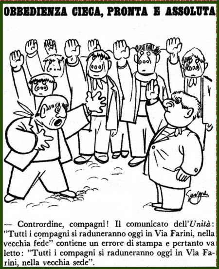 Non possiamo provare che Librandi abbia obbedito a un ordine dalla Leopolda. Del resto non occorre, capisce anche da solo che certe voci sono sgradite; il totalitarismo di oggi, meno d’acciaio di quello staliniano, anzi flaccido e buonista, non ha bisogno di direttive se non implicite: intere classi abituate alla passività di fronte alle oligarchie, lo preparano spontaneamente, perché già sono assuefatte a “vivere nella menzogna” televisiva, burocratica, politicamente corretta. Il politicamente corretto è già la definizione di “crimini di pensiero” o psico-reati che in epoca sovietica erano puniti col GuLag. Il titolone de La Stampa segnala già la nuova fase del sovietismo flaccido: quelli che si sono opposti al referendum di Renzi, non hanno esercitato il pluralismo di idee ed opinioni ed usato il diritto democratico alla critica; sono stati influenzati “dal Cremlino” e “ne hanno fatto il gioco”. Sono quindi “nemici interni” , e “oggettivamente” servi del nemico esterno. Nel momento in cui “si riaffaccia il mostro fascista”, questa loro libertà non va tollerata, perché “sono in pericolo le conquiste e i valori della democrazia”