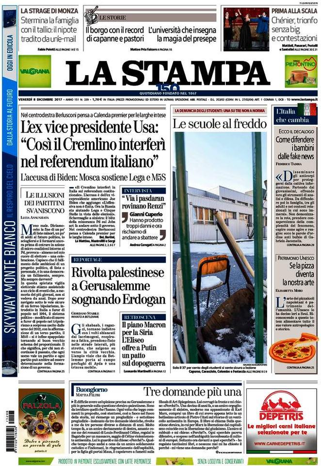 “Così” come?, magari vorreste chiedere. Ovviamente non è spiegato alcun “come” Putin ha interferito nel referendum di Renzi Matteo per farlo perdere. Il giornale israeliano di Torino vuole che lo crediamo sulla parola: qui già potete intravvedere come La Stampa stia diventando, per sinistra metamorfosi, la Pravda (Verità) del nostro domani.