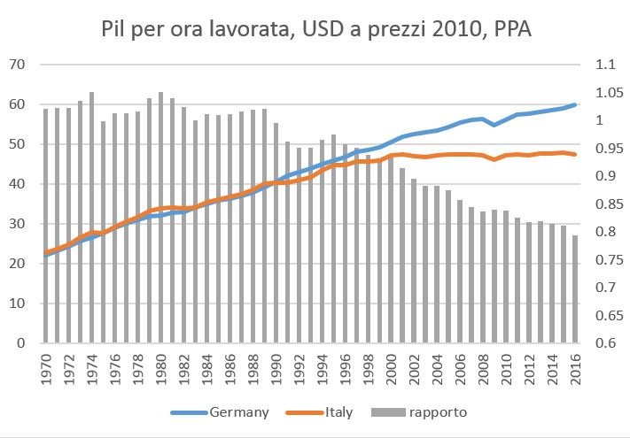“L’avete sentita dire, vero, la storia che il declino dell’economia è cominciato non dagli anni ’90 (inizio del percorso di ingresso nell’euro con aggancio all’Ecu), ma dagli anni ’80, o addirittura ’60, o dalla III guerra di indipendenza, o dal Triassico. Per vostra comodità, qui il grafico che riporta il Pil per ora lavorata in Italia e Germania, espresso in dollari costanti a PPP, e il rapporto fra le due serie.