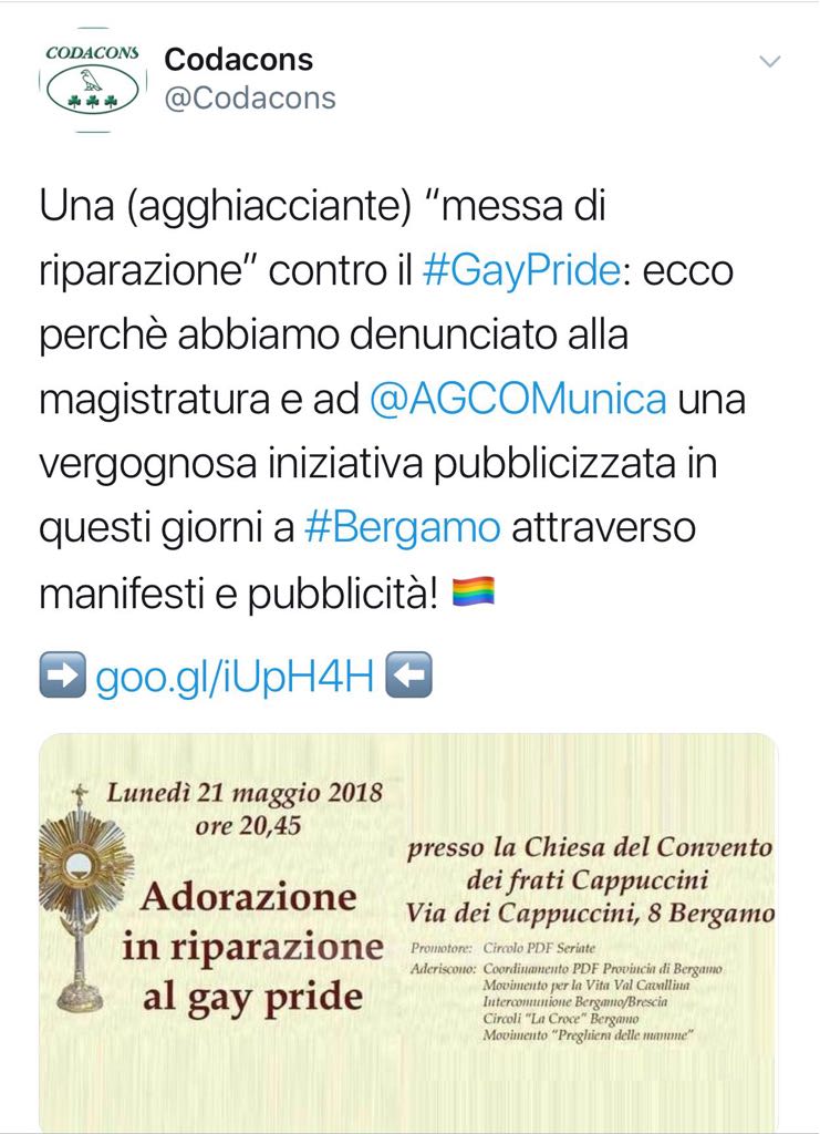A Bergamo ieri si è svolto il Gay Pride. Una preghiera di riparazione organizzata nella Chiesa dei cappuccini è stata ostacolata e alla fine stoppata dalla Curia diocesana. Avrebbe dovuto tenersi oggi. Al suo posto, questa sera, ma sul sagrato della Chiesa, avrà luogo un rosario di riparazione.