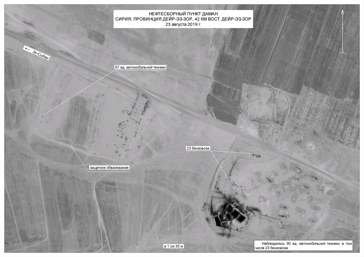 23  autobotti  sono identificabili in questa immagine aerea catturata nei pressi di un impianto di raccolta dell’olio a 42 km a est della città di Deir ez-Zor, secondo il MoD russo.
