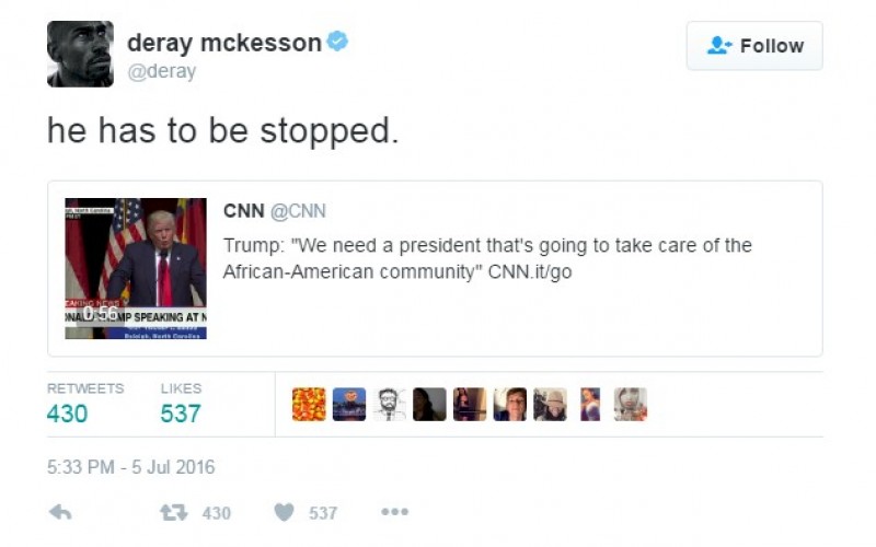 L’autore di questo tweet è, o sarebbe, Deray McKesson, un militante e un politico negro (è stato candidato sindaco di Baltimora) che oggi è a capo del movimento di protesta “Black Lives Matter” (Le vita dei neri contano), nato dopo l’omicidio di un ragazzo negro a Ferguson, Saint Louis nell’agosto scorso. Deray McKesson e i suoi attivisti sono anche quelli che, effettivamente, girano l’America (pagati da Soros) per disturbare tutti i comizi di Trump con urla, insulti e minacce ai simpatizzanti del “candidato razzista”.